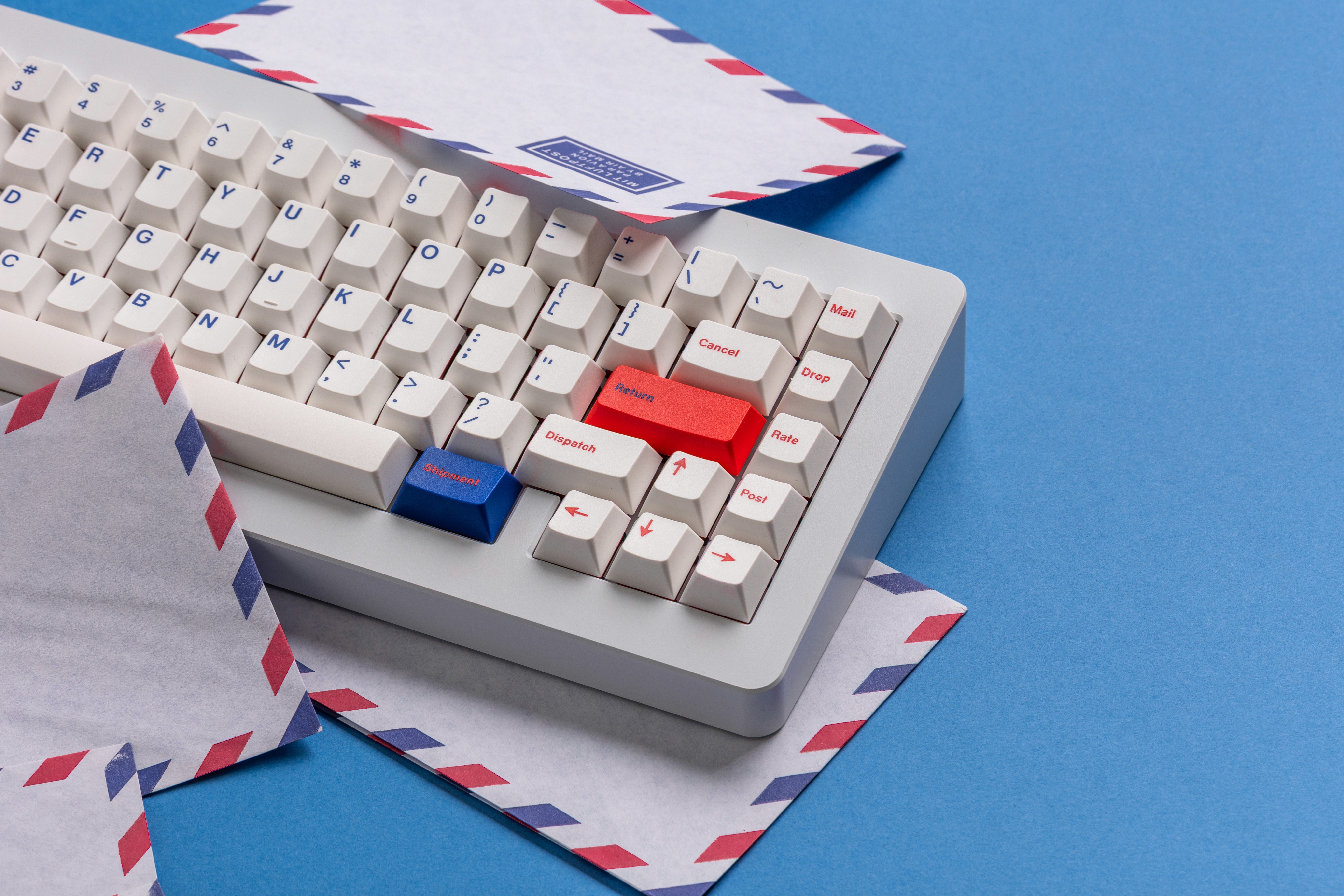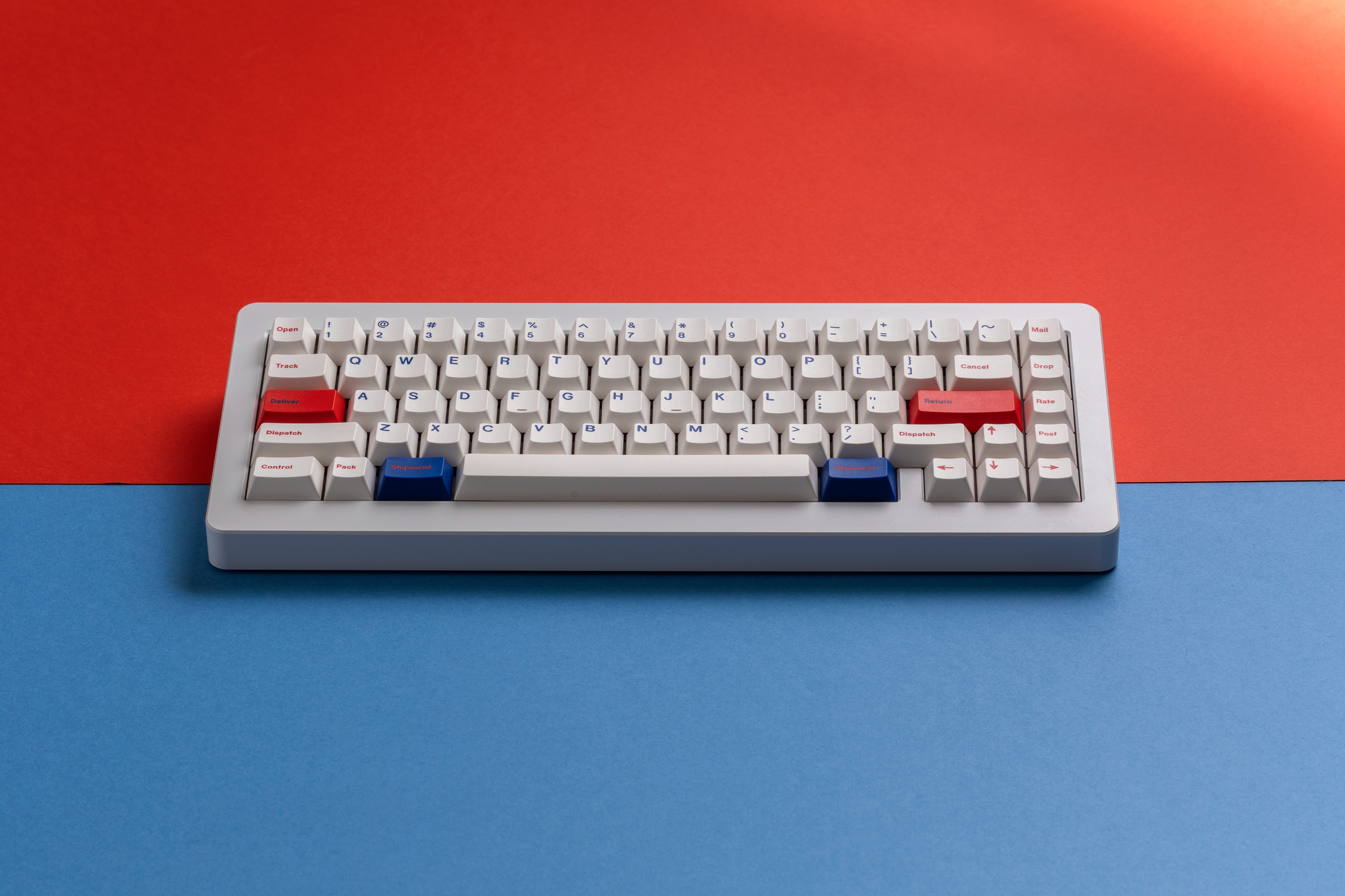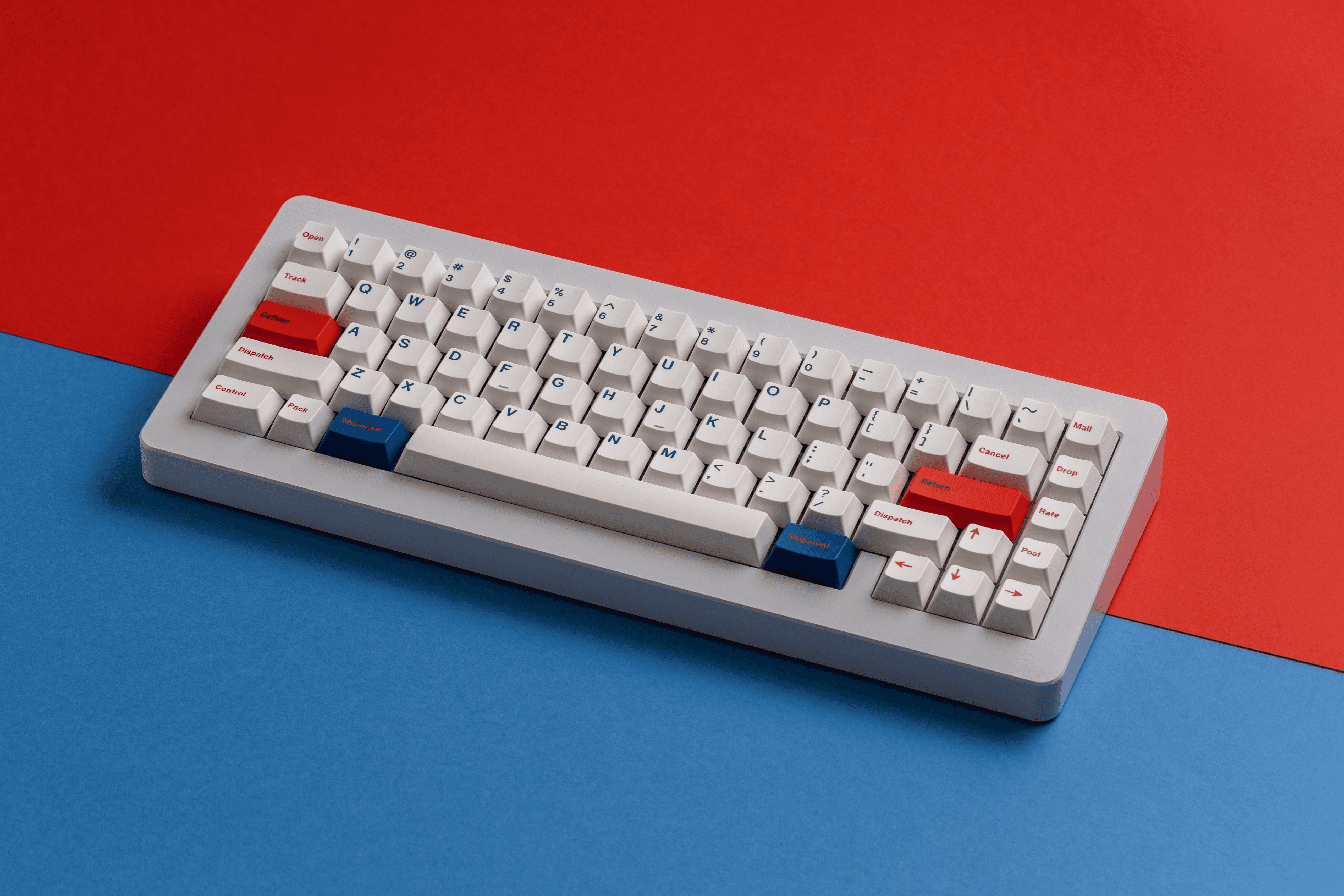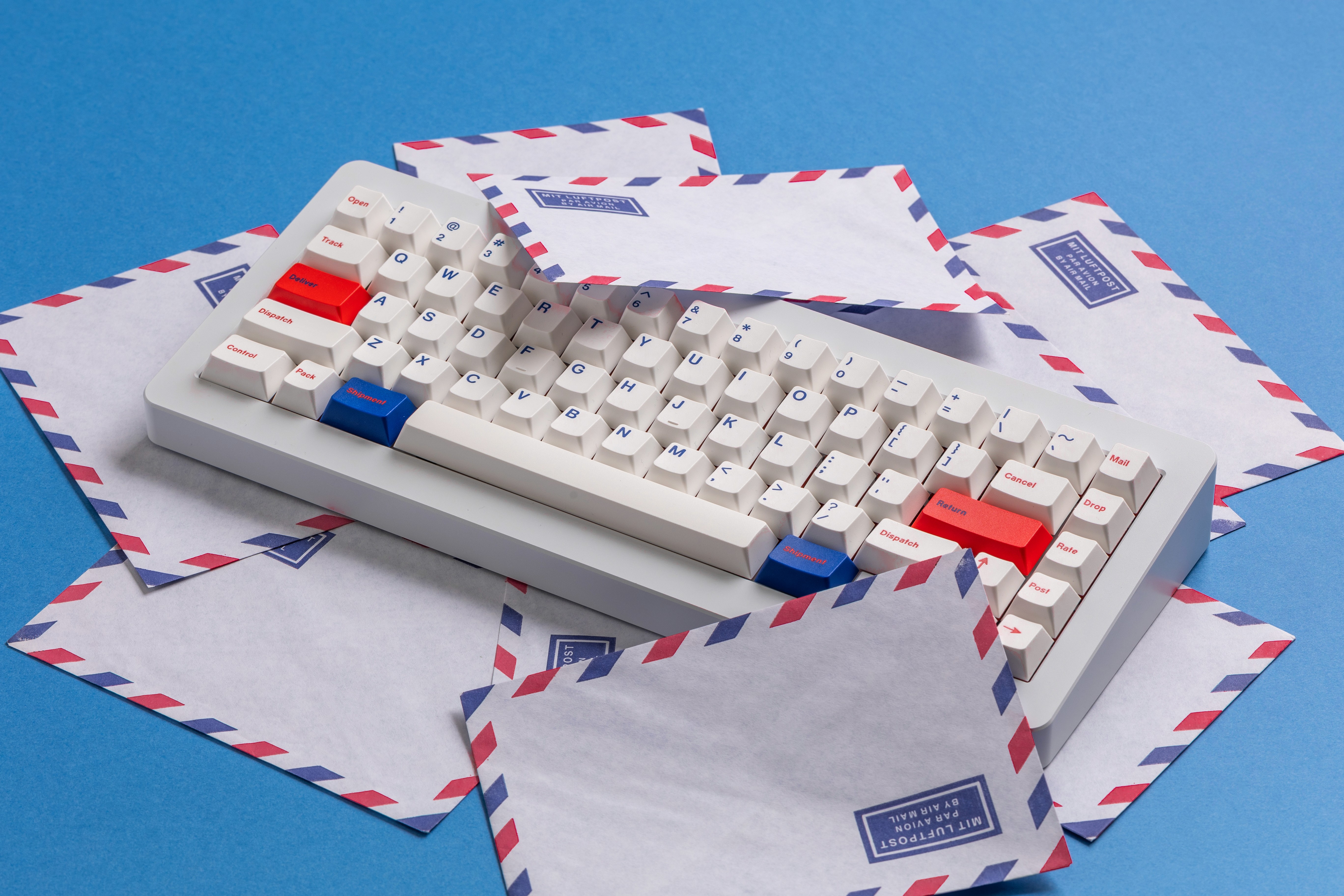 I wanted to create something that felt familiar yet special, so I chose the postal theme because everyone can relate to sending and receiving packages. The keycaps feature custom legends with shipping-related words like "Deliver," "Ship," "Dispatch," "Parcel," and "Return." I decided to replace the standard legends with this postal vocabulary because I thought it would make typing feel more playful while keeping the overall design clean and readable.