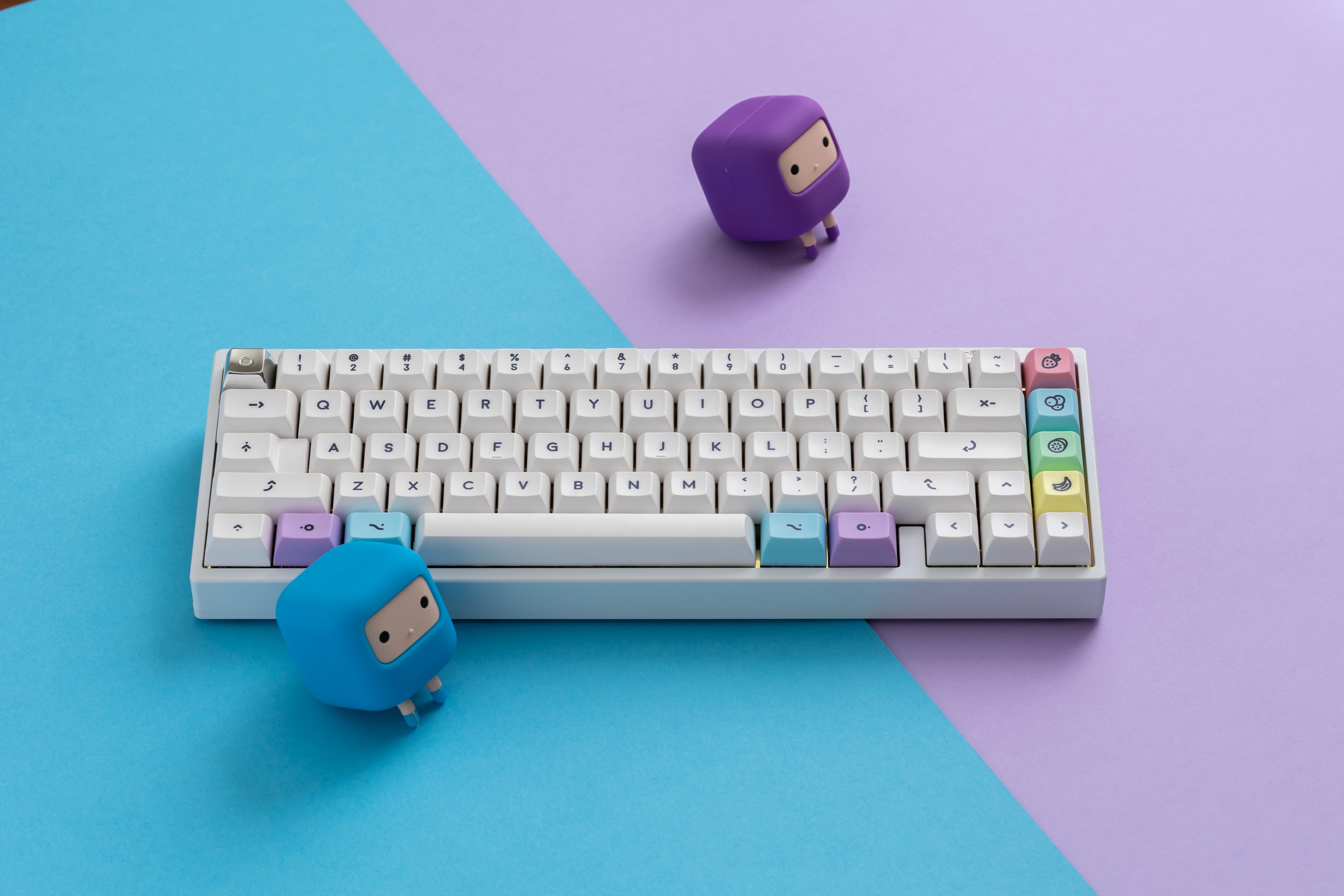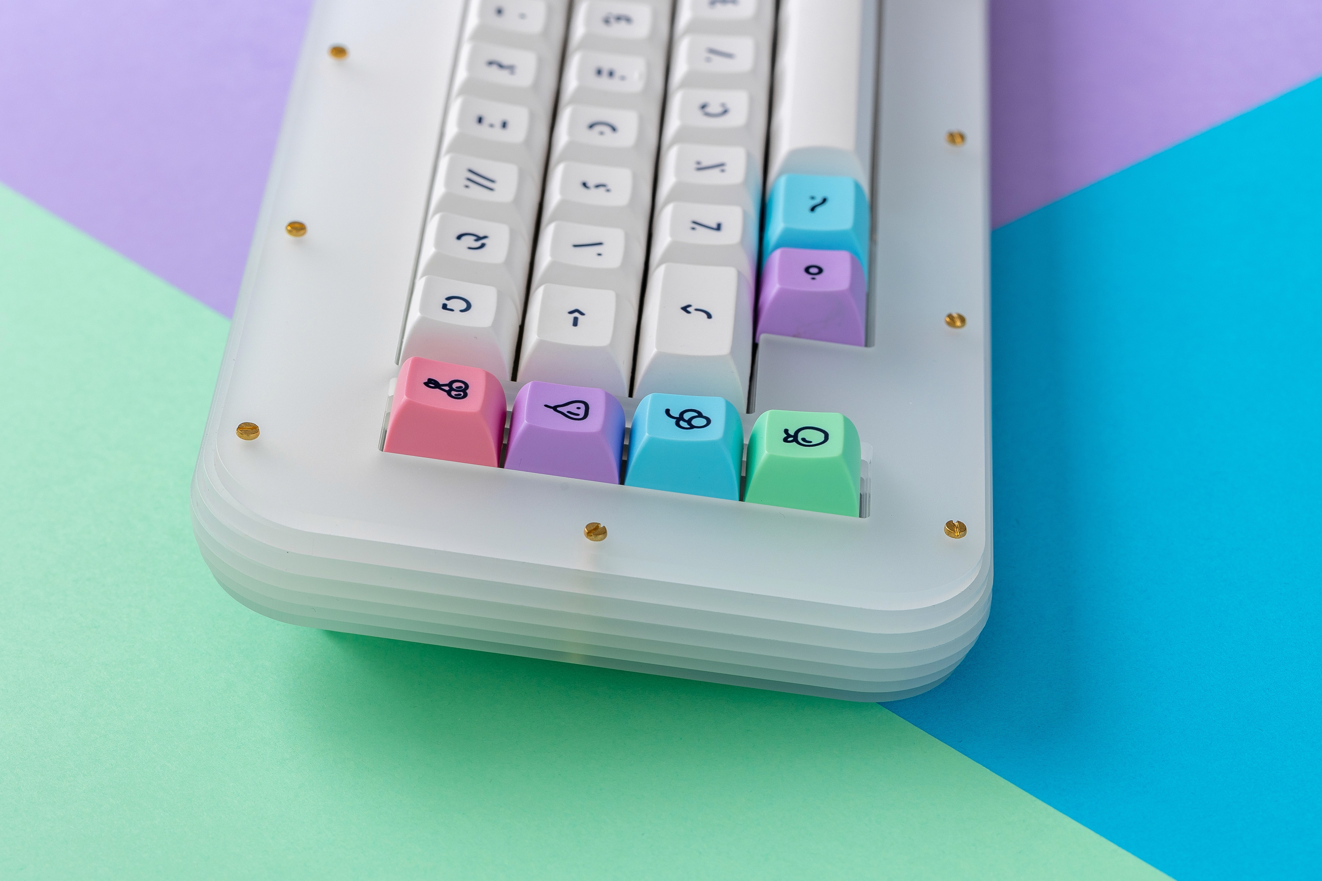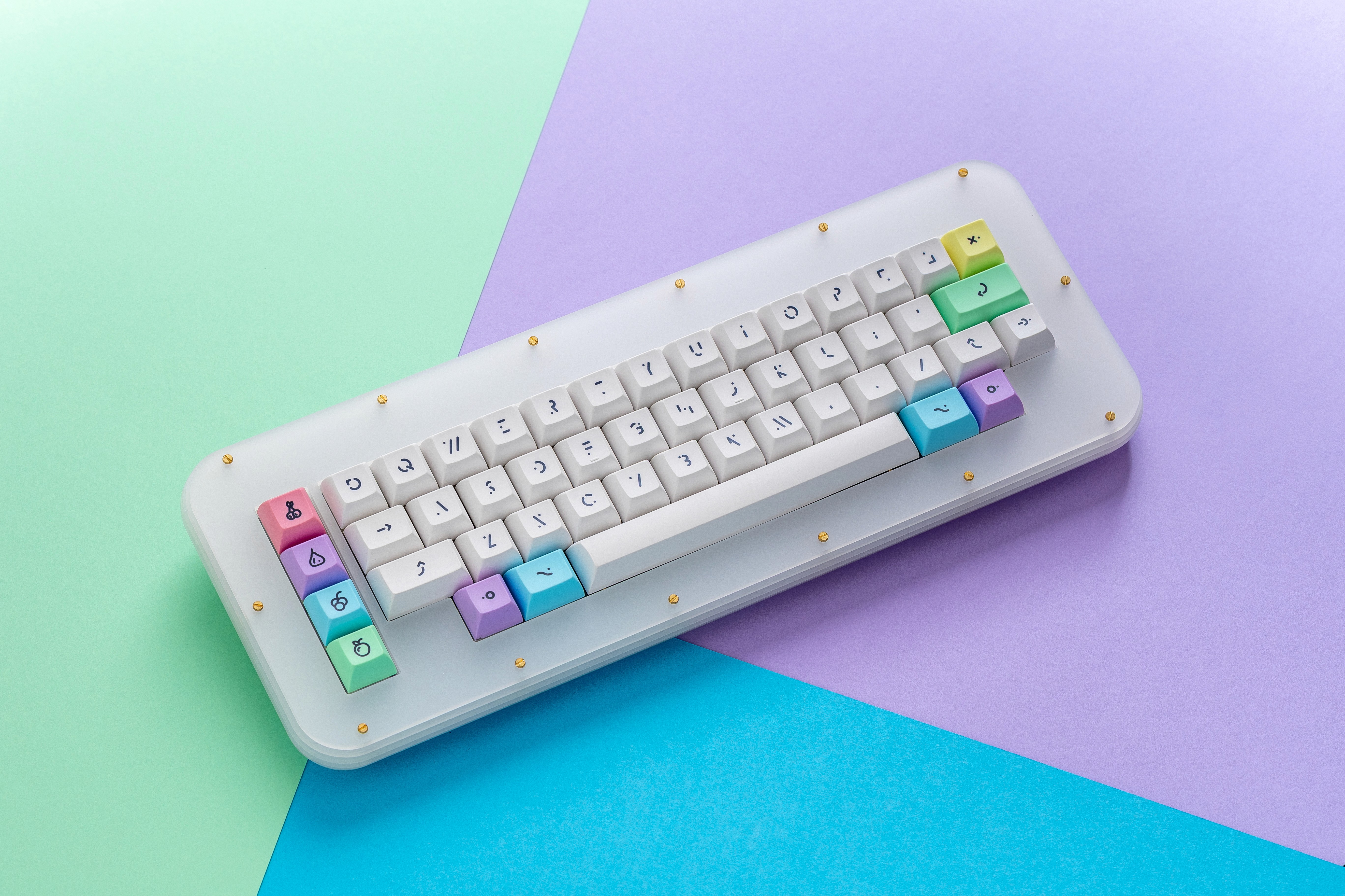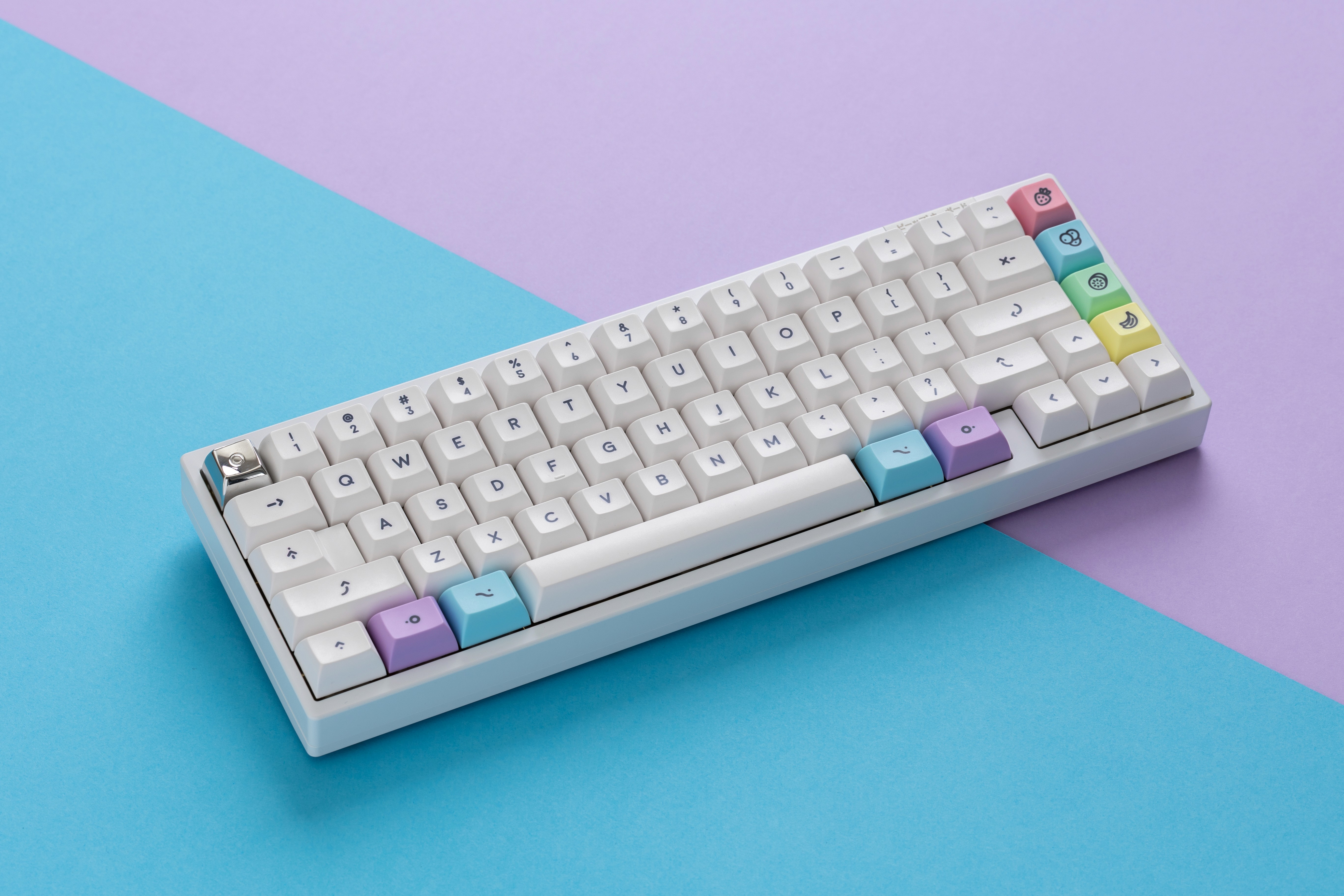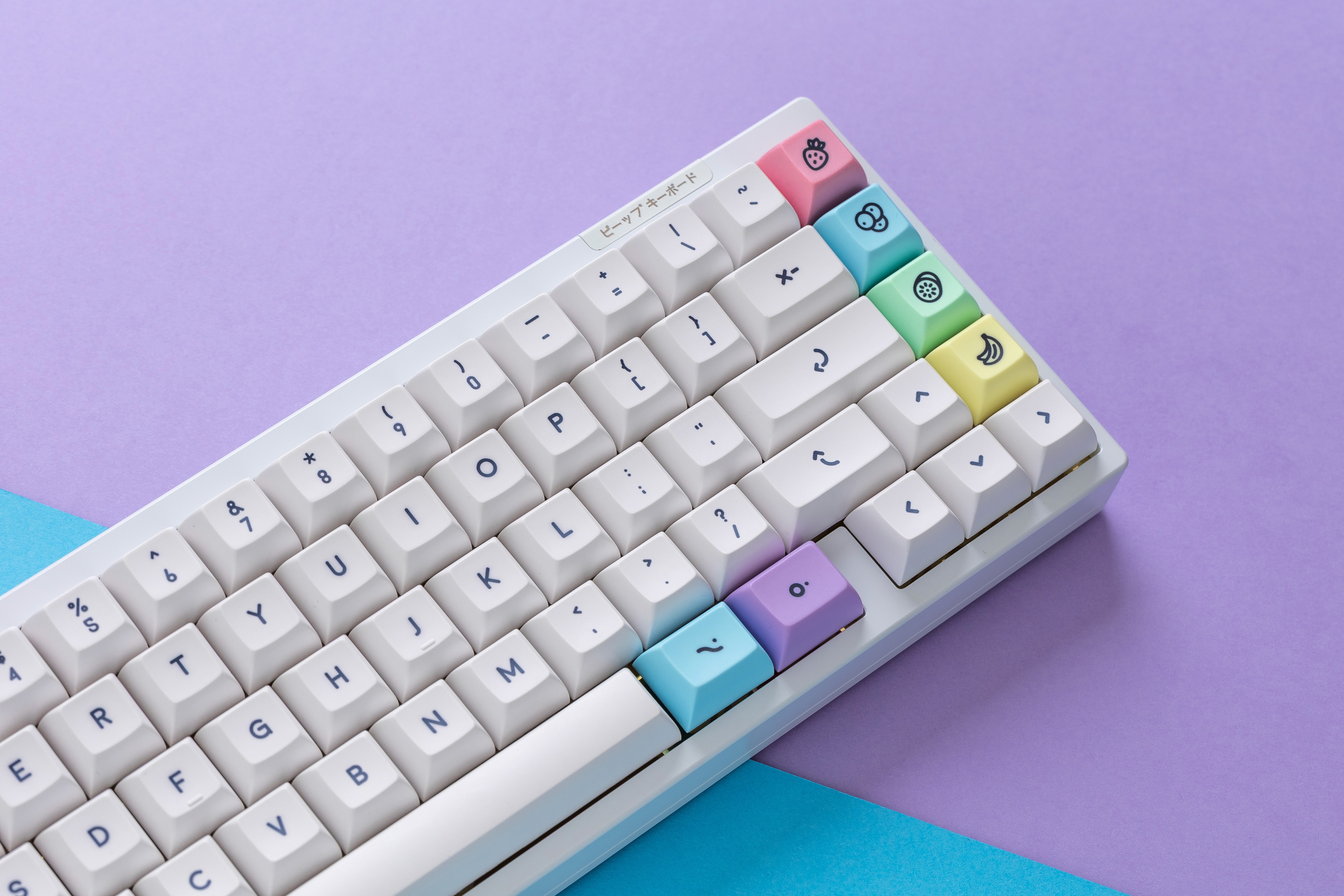 It is a playful keycap set that brings together soft pastels and colorful fruit-inspired accents. The base uses slightly warm off-white keycaps with rounded uppercase lineal dark legends that create excellent readability while maintaining a gentle, approachable look.