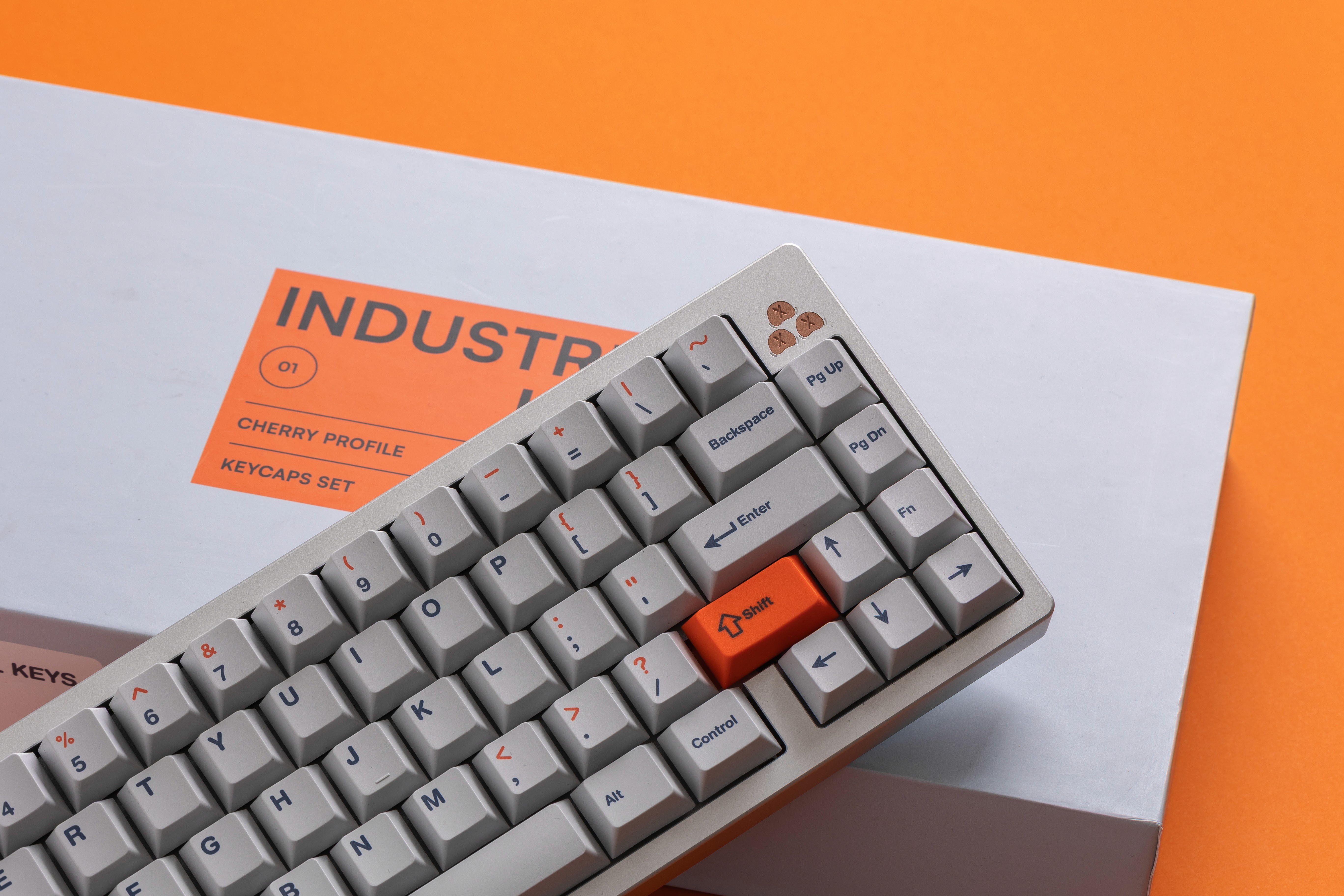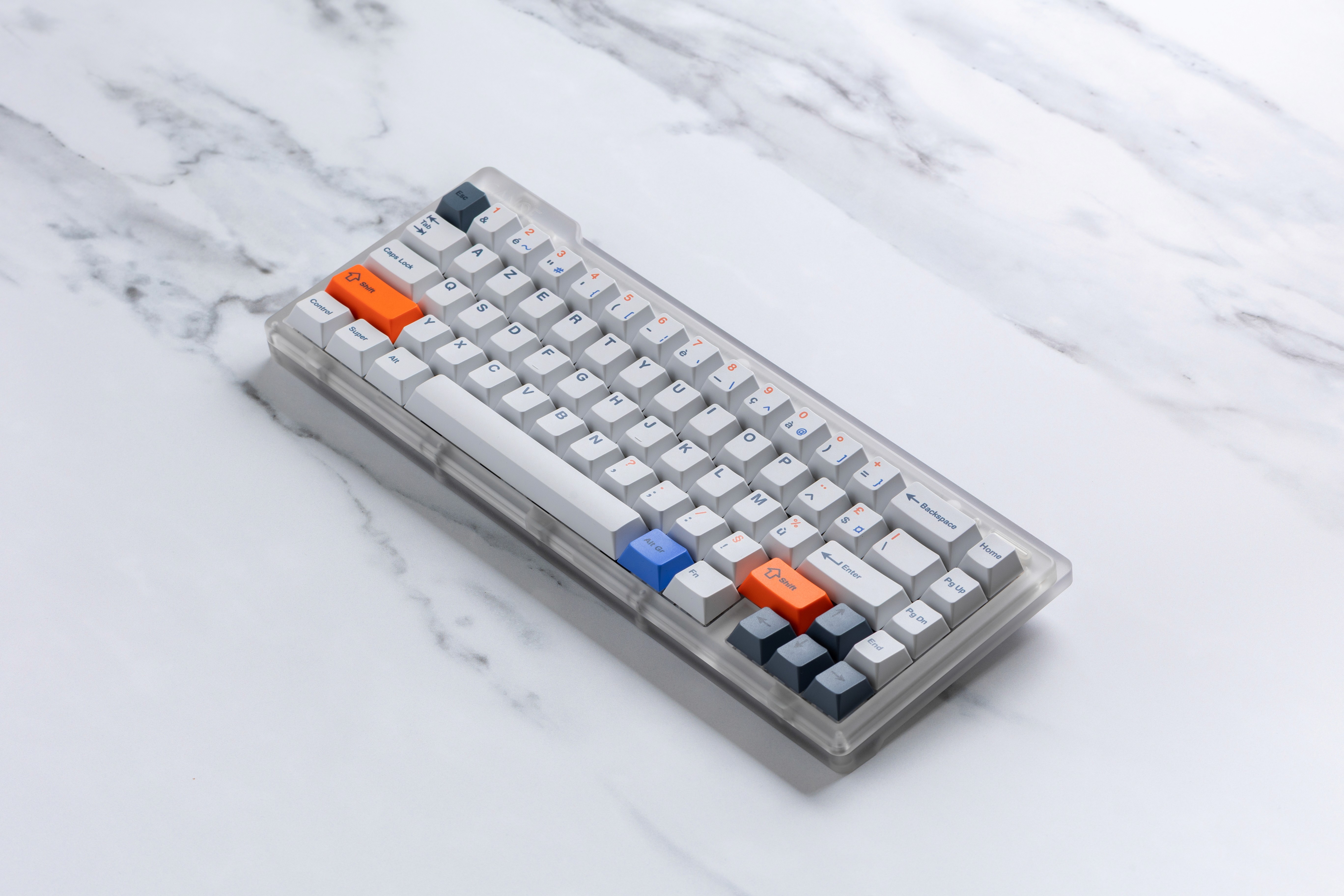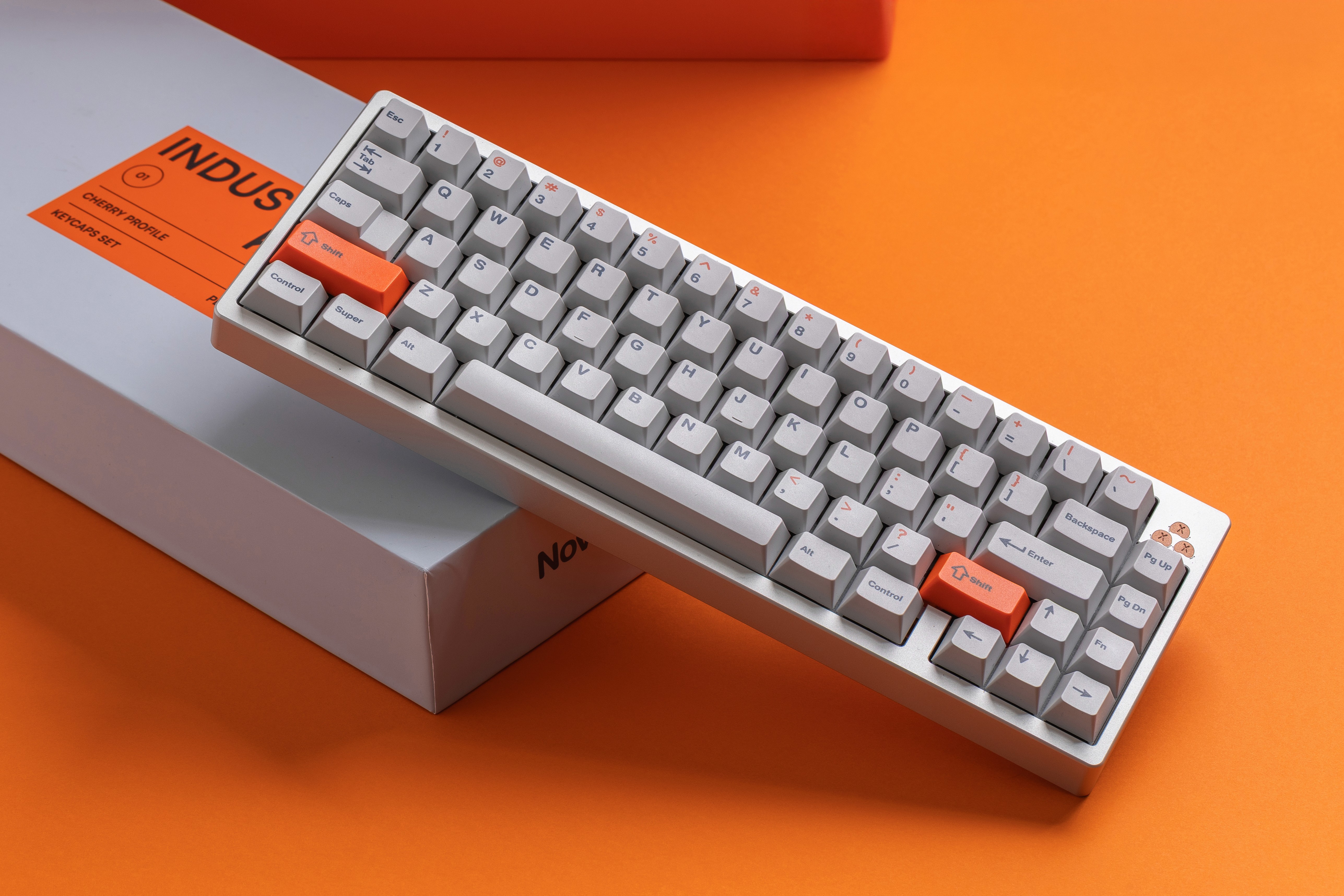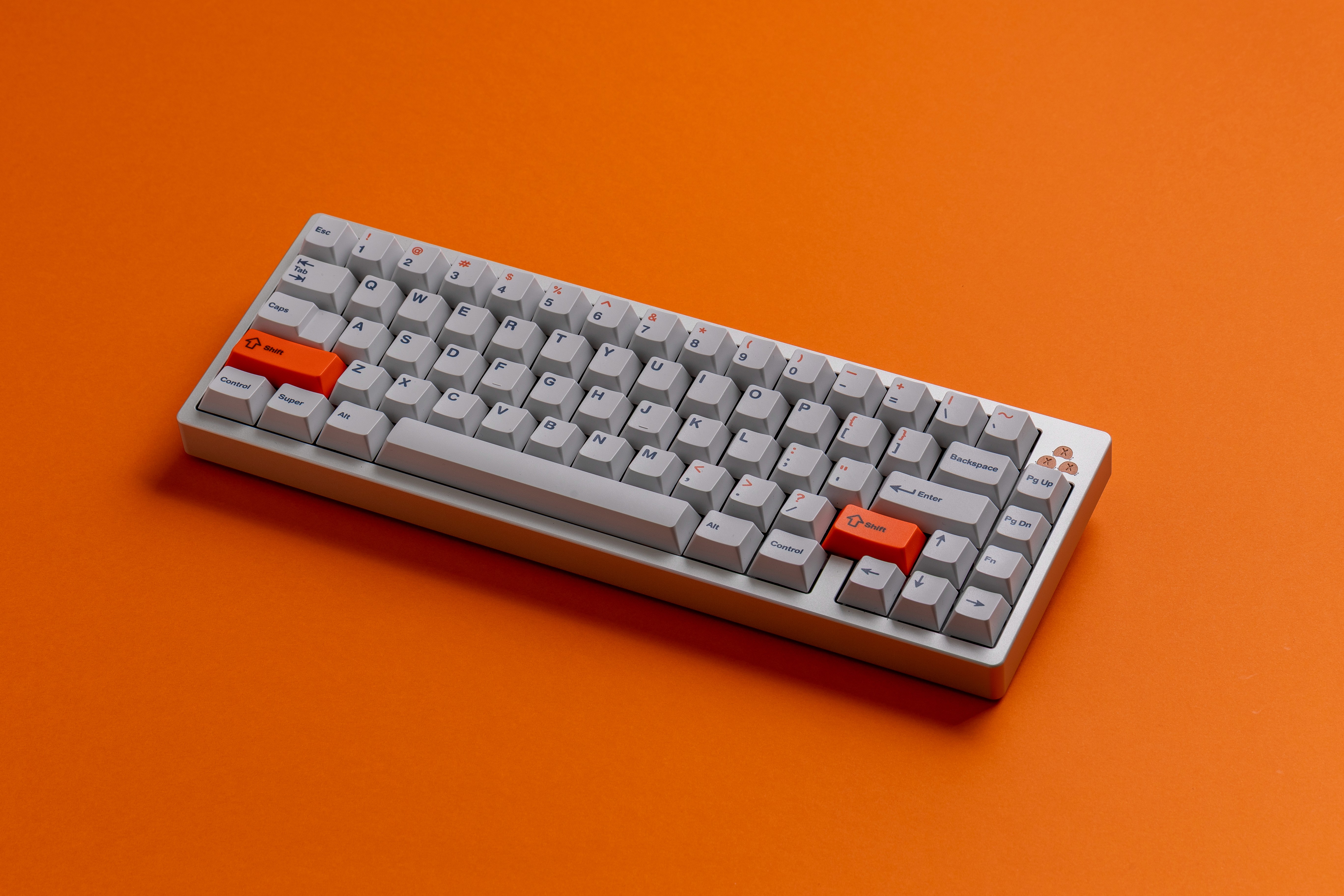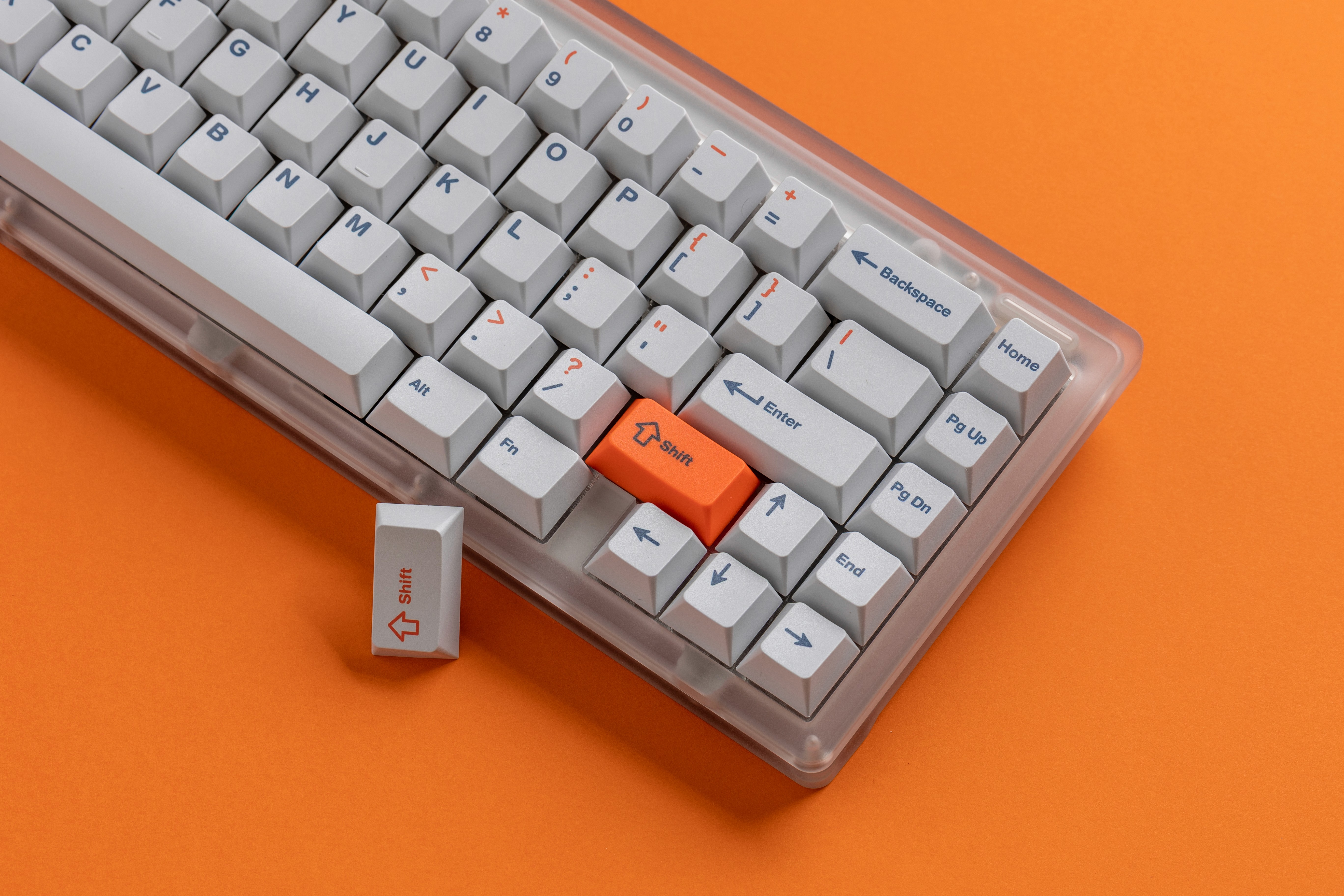 The standout feature is the bright orange accent system, which serves as both decoration and functional guidance. I decided to use this pop of color very strategically. Indeed, you can see it on the Shift key and also on the top legends of the number row keys (the symbols like !, @, #, etc.). My goal was to create a visual connection between the Shift key and the characters that require it to be pressed.