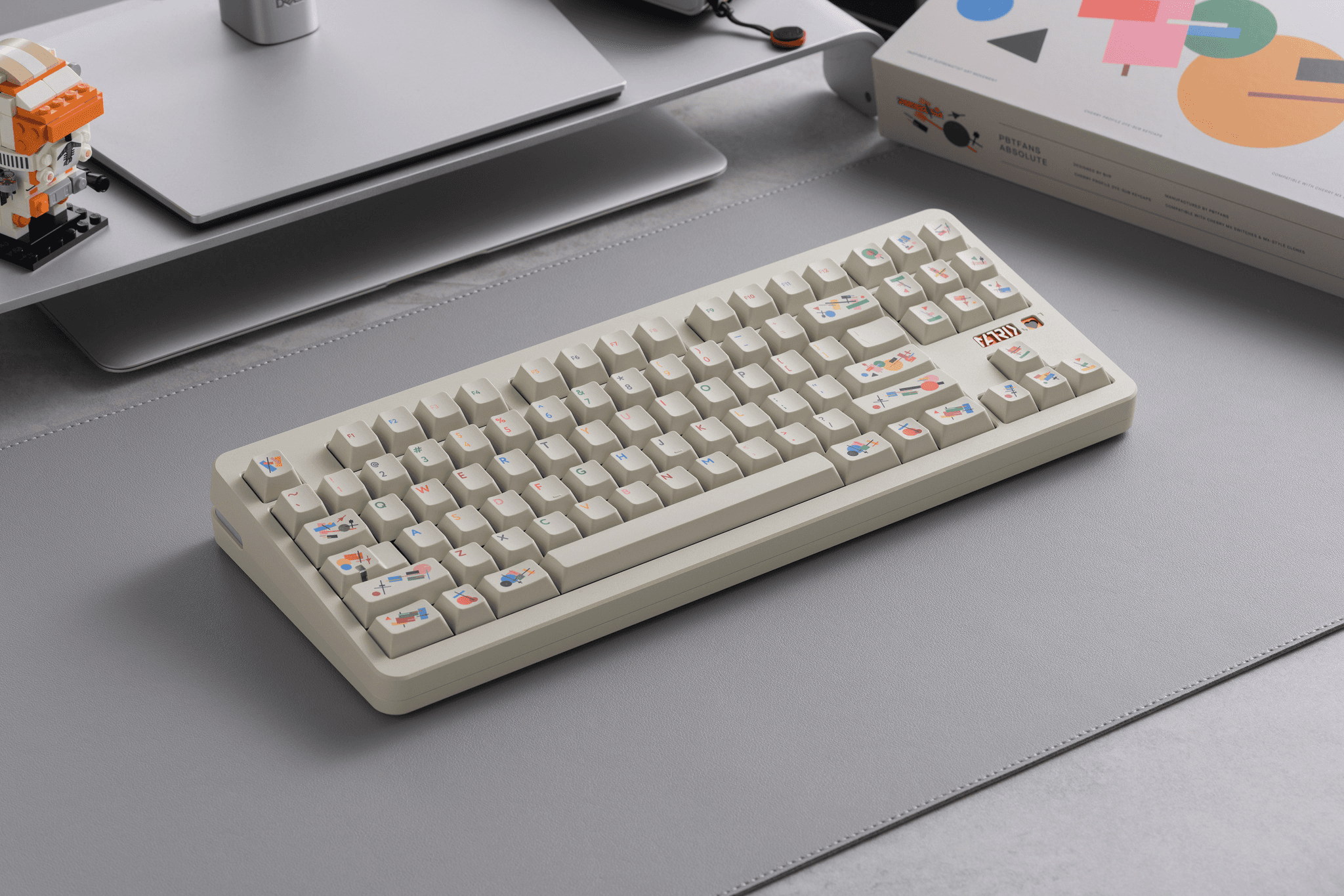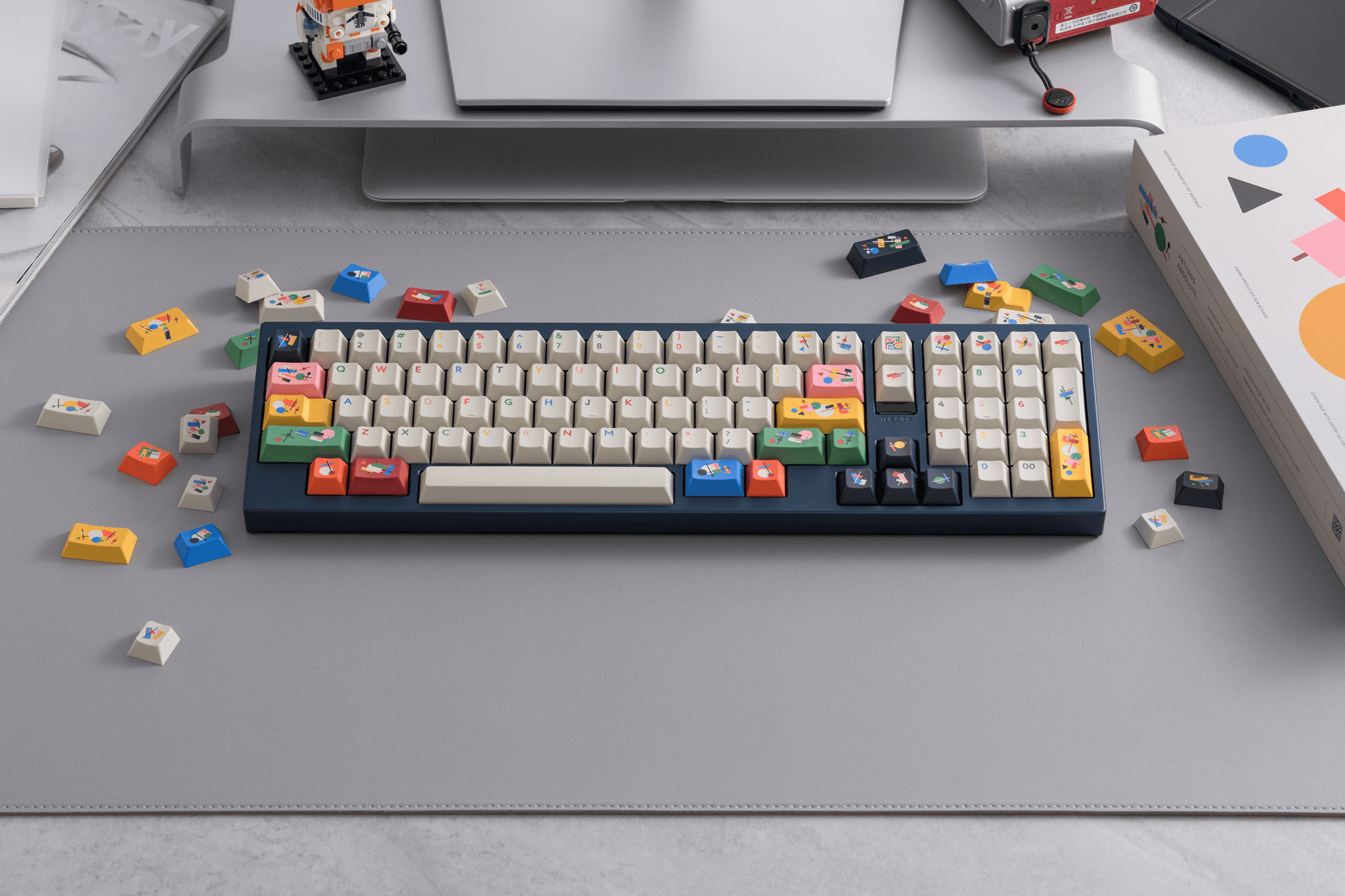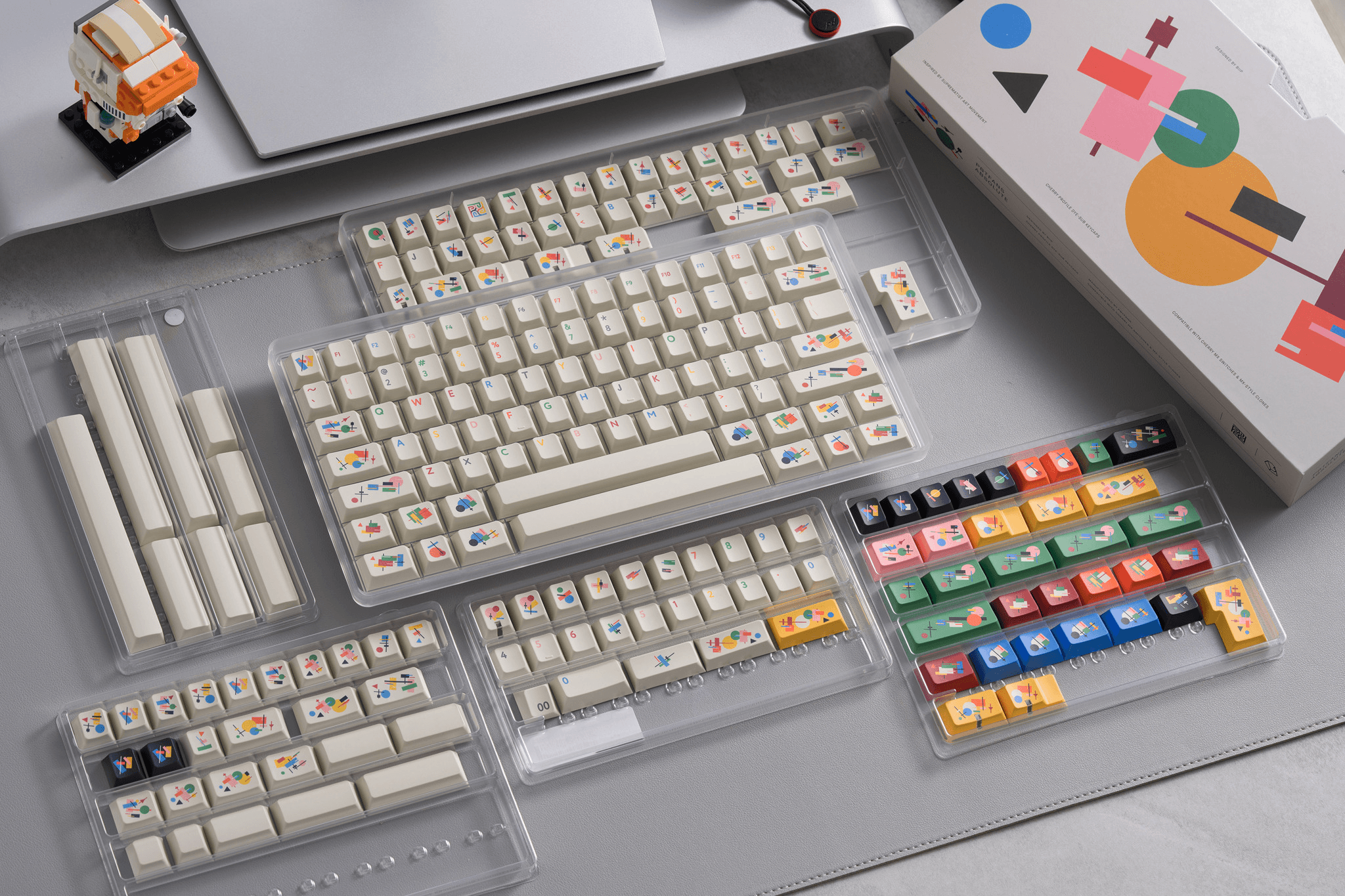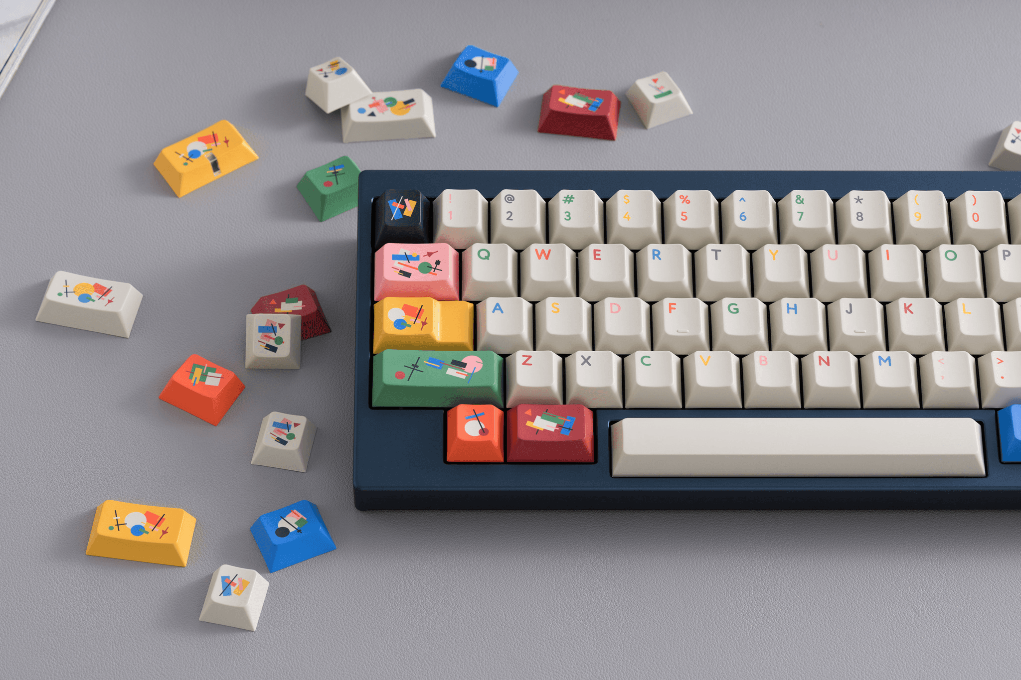 The set features a warm beige base color (GMK L9) that serves as a canvas for geometric compositions that follow Suprematism's principle of alogism: geometric shapes overlapping without strict hierarchy, colors combining without seeking conventional harmony, and elements floating freely in space. These compositions do not carry symbolic meaning: they exist as pure visual form. That's why this keycap set isn't meant to have any deeper meaning, but is simply there to be appreciated visually.