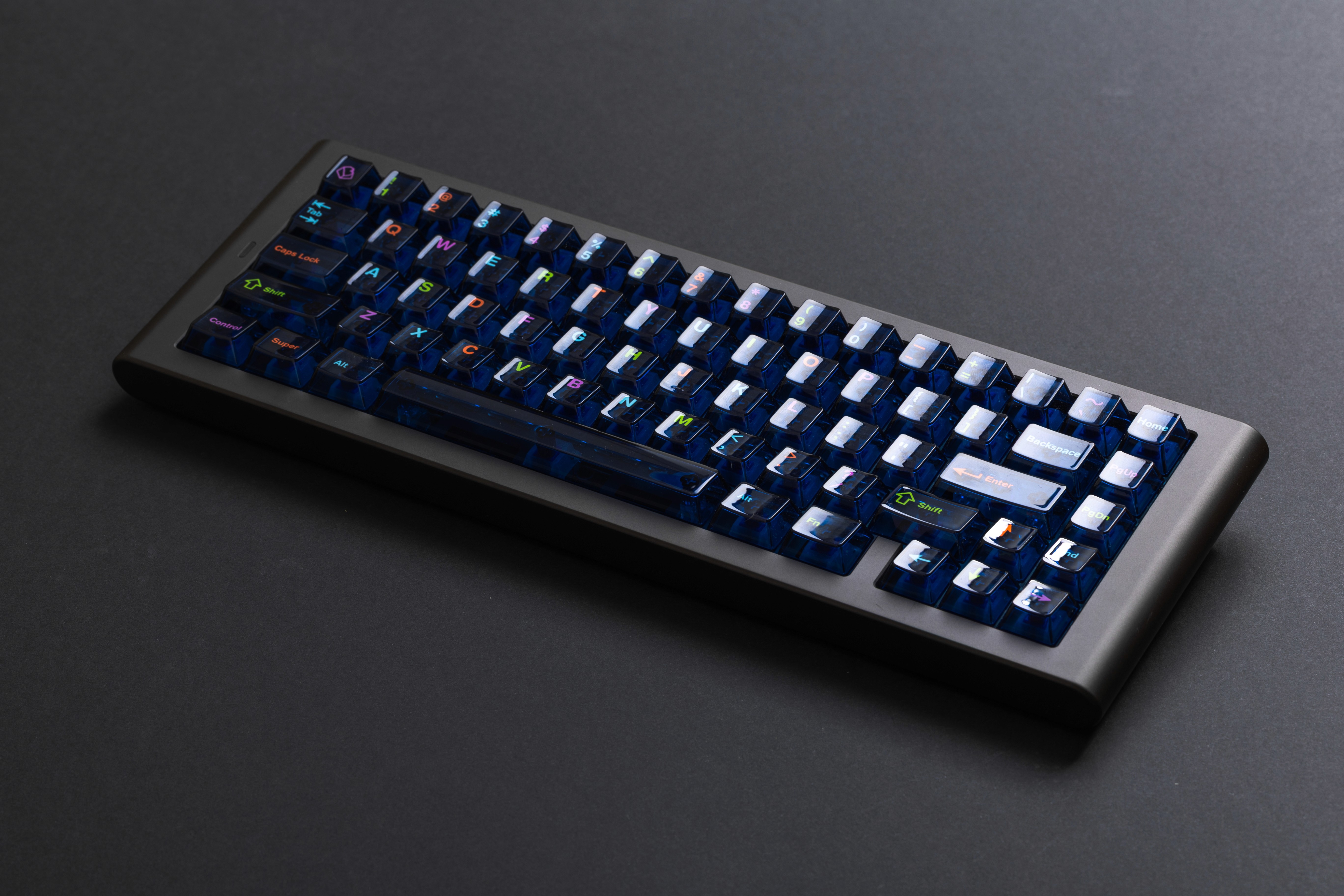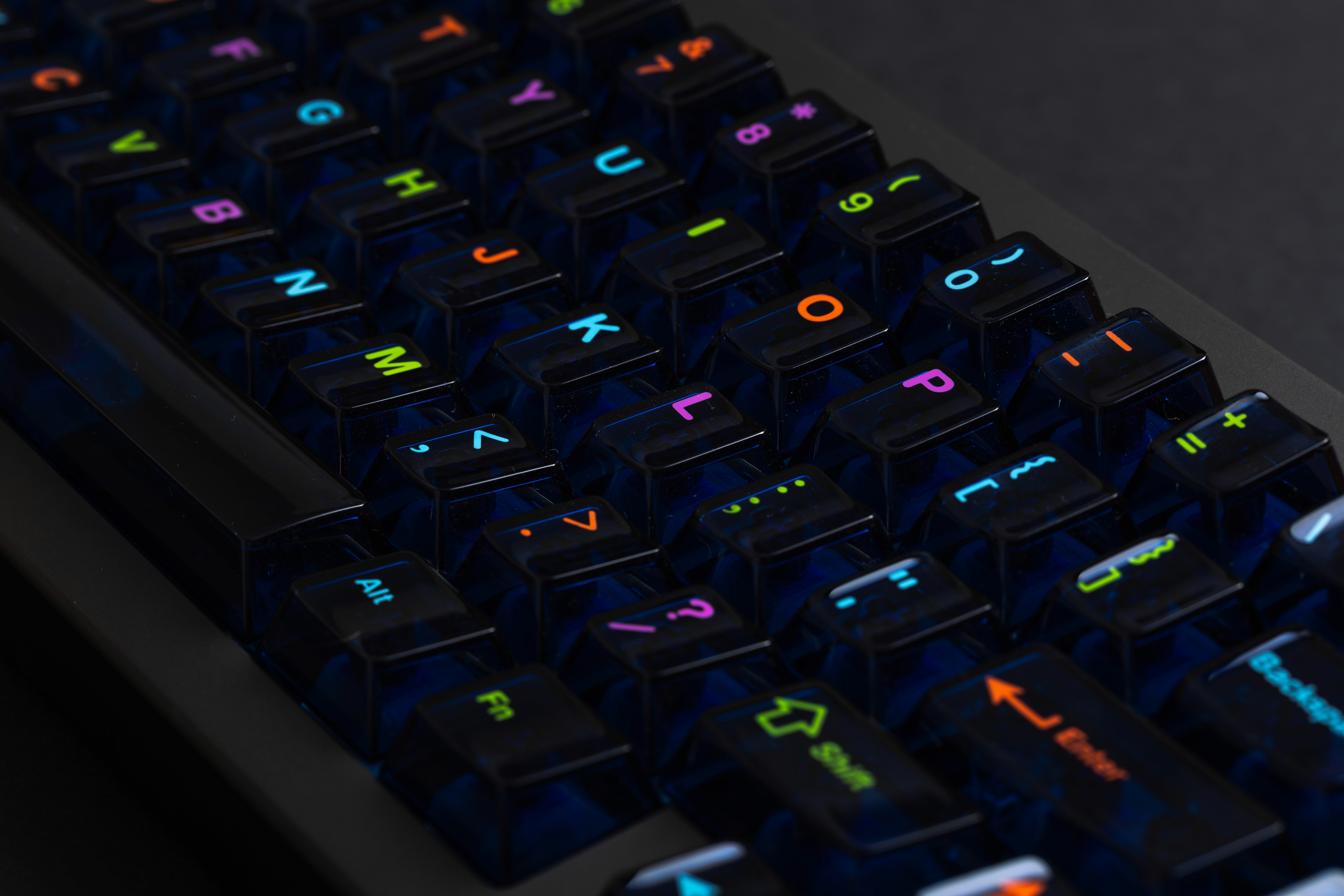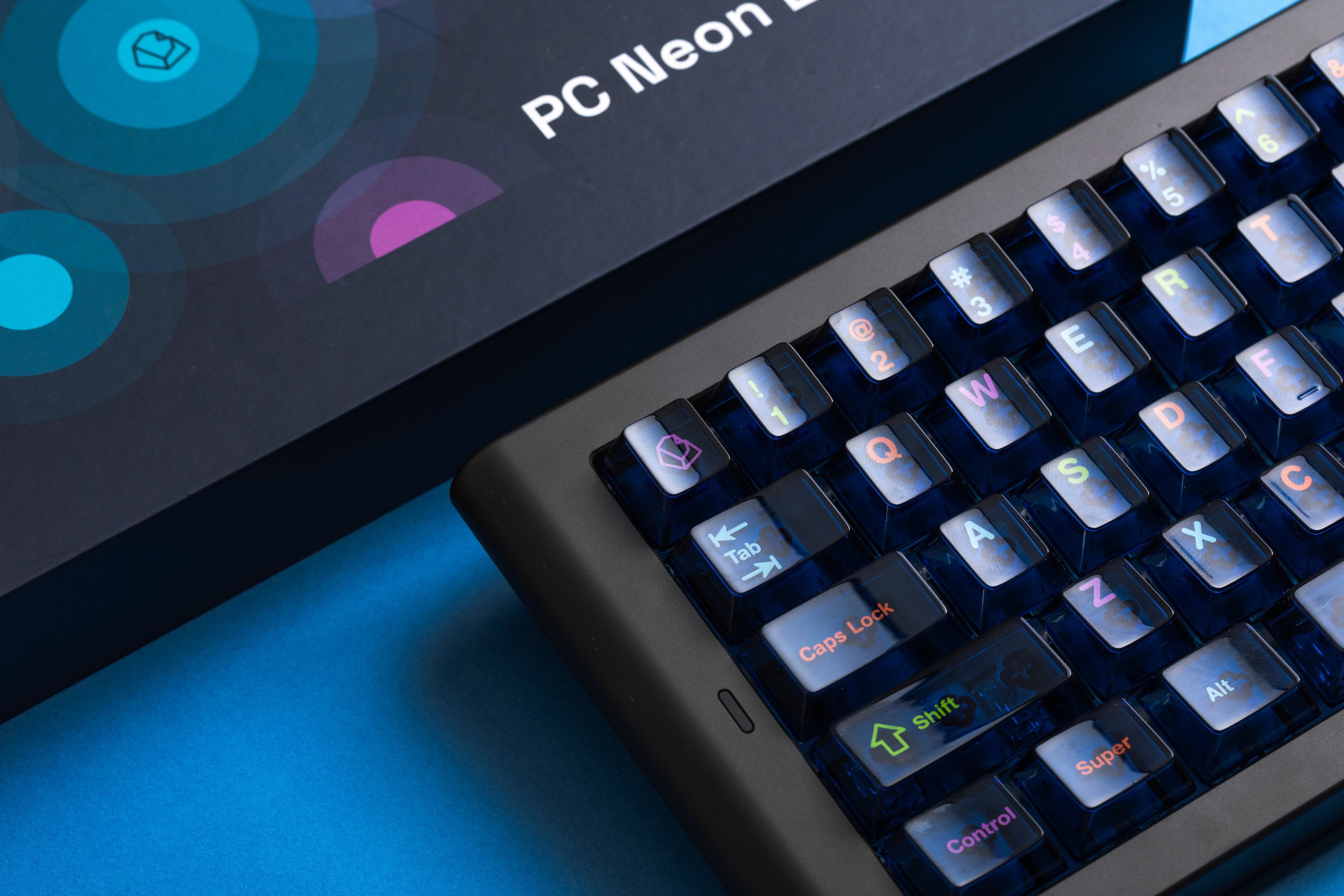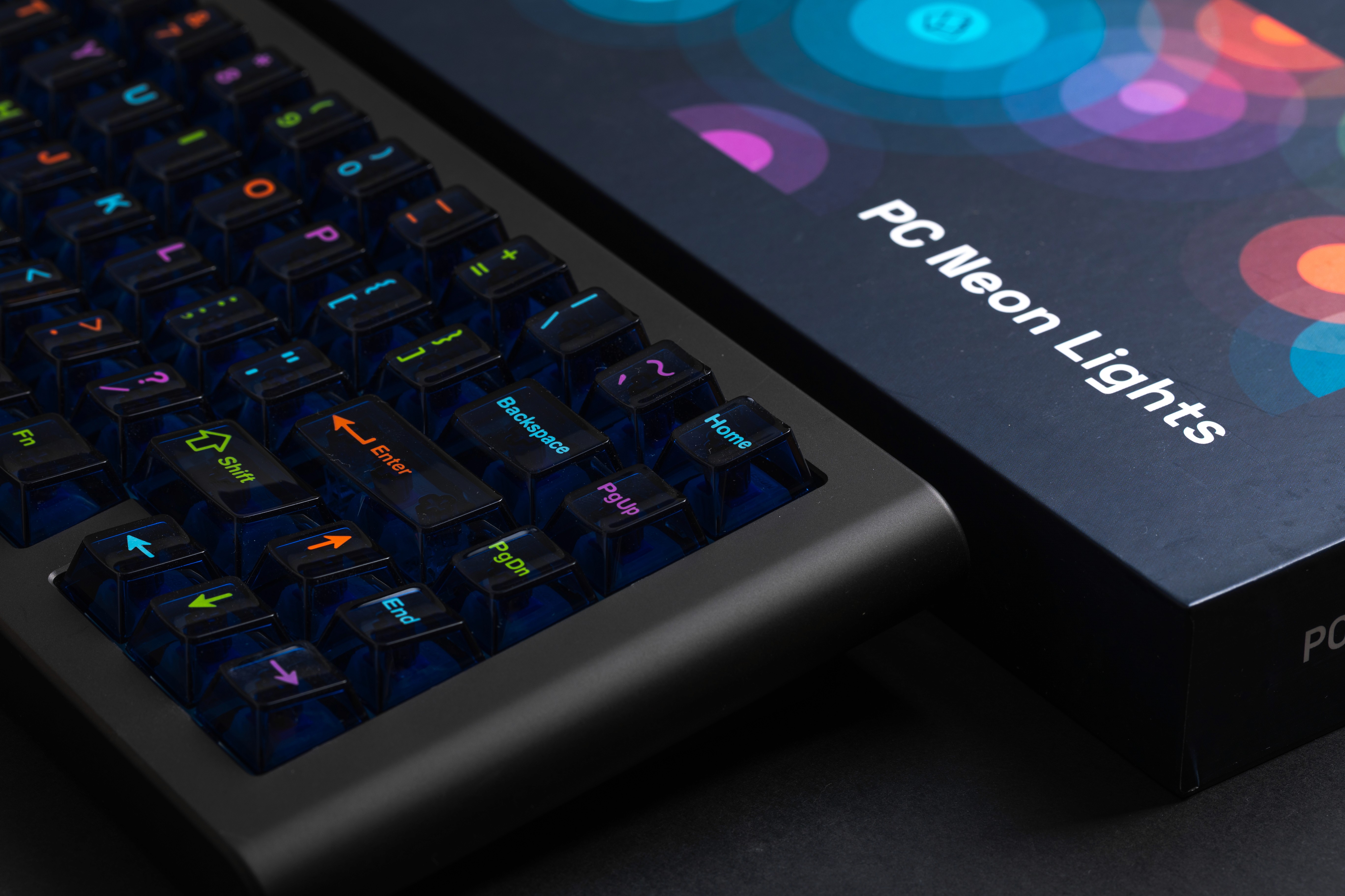 PC Neon Lights is a keycap set that captures the vibrant energy of neon-lit cityscapes and gaming culture. The design features a sleek dark cold semi-opaque gray base with bright, colorful legends that seem to glow against the dark surface.