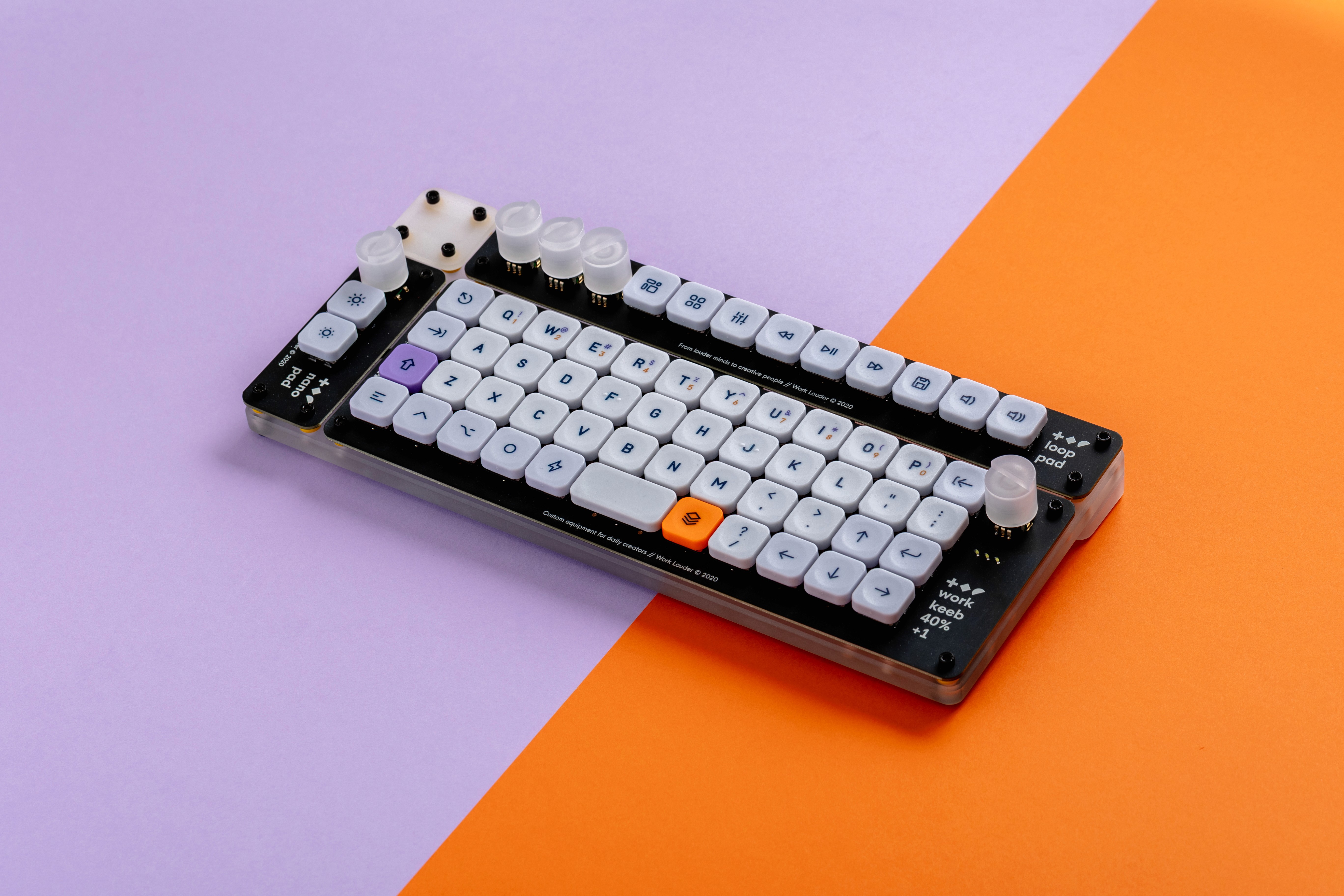Cartridge is a keycap set that draws inspiration from retro gaming aesthetics while maintaining a modern, clean approach to design. The set features a light gray foundation with strategic use of purple and orange accent colors that create visual hierarchy and functional distinction across the layout.